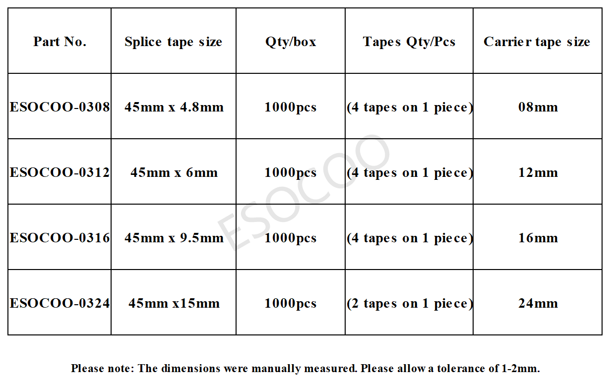 Esocoo's four-in-one or two-in-one single splice tape is designed for use with copper buckles to join SMT component carrier tapes. This universal solution fits any machine and tape width, providing a precise, secure connection to minimize waste and reduce costs. Available in multiple colors for easy identification and workflow organization.