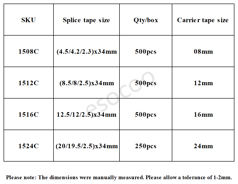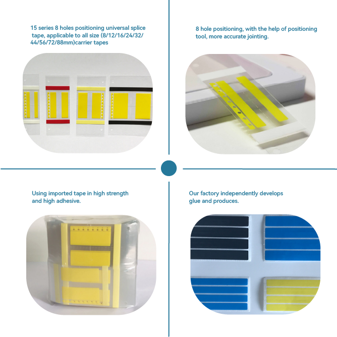 Universal 15 Series 8-hole splice tape ensures precise, tool-free carrier tape jointing for all sizes. Featuring a high-strength adhesive polyester film and automatic production compatibility, it offers reliable performance for all SMT machines. Made with proprietary glue for superior adhesion and positioning accuracy.