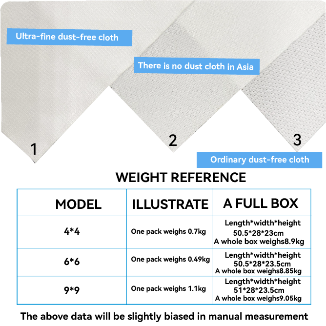 Standard Wipes Use Case: General cleaning where high purity isn't critical. Key Feature: Cost-effective with high absorbency. Applications: Workshop equipment, machinery, computer/phone casings. Sub-Microfiber Wipes Use Case: Cleaning sensitive surfaces with moderate purity needs. Key Features: Highly absorbent and soft. Applications: LCD screens, UV printheads, phone/computer displays, standard lenses.