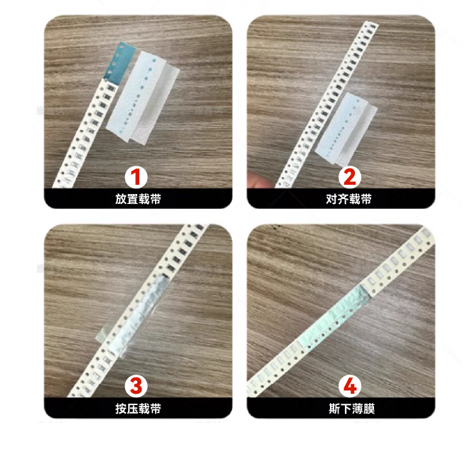 1.Trim the SMT tape along hole centers. 2.Remove the backing paper. 3.Align the raised film dots in the splice holes and press to bond. 4.Fold along the tape center, bond the other side, remove backing, and press again for a secure connection.
