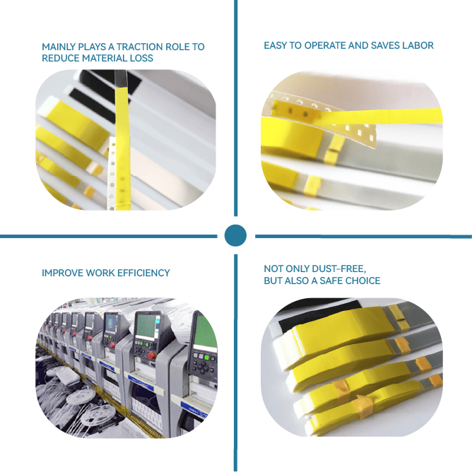 High viscosity, strong durability, safe and firm, easy to operate, saves manpower and material resources, improves production efficiency, effectively connects and pulls residual small parts.The use of material guides can reduce component waste, ensure that materials can be effectively utilized, and effectively reduce production costs by reducing downtime.For time waste and production interruption, anti-static tape can be chosen.