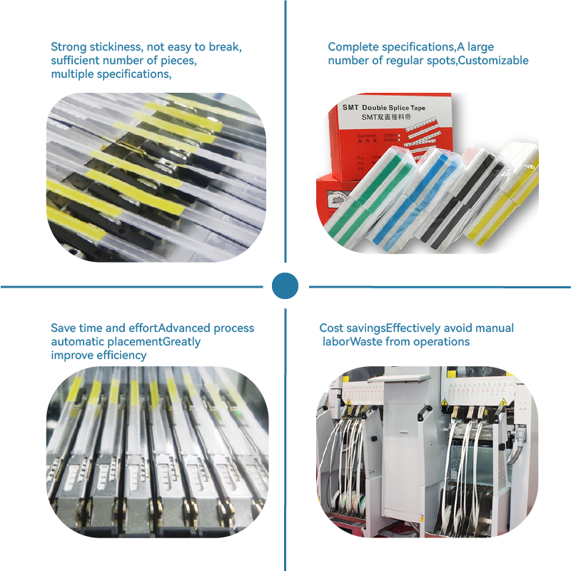 This SMT Double Splice Tape ensures efficient and reliable jointing of carrier tapes in SMT production. Made of two high-strength adhesive tapes, release paper, and PET material, it provides secure splicing with minimal waste. Its two-tape design with alignment holes allows precise positioning without extra tools, saving time and labor. It fits carrier tapes of 8mm, 12mm, 16mm, 24mm, 32mm, 44mm, and 56mm widths, with optional ESD protection, supporting high-density automated assembly while improving efficiency and reliability. Compatible with most SMT machines, except sensitive types.