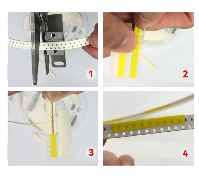 01.Cut the carrier tape precisely using the cutting tool. 02.Peel the splice tape liner to expose the adhesive. 03.Align the cut carrier tapes on the first strip of splice tape, then fold the second strip under and press firmly. 04.Remove the plastic cover and guide to complete the splice.
