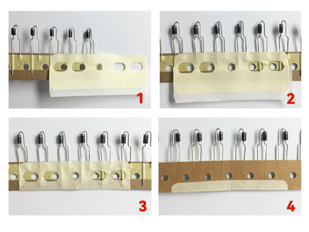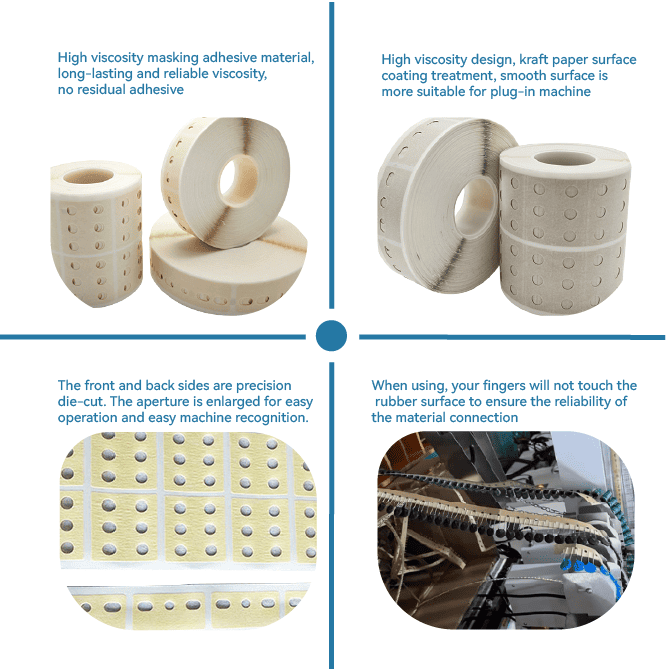 The AI splicing tape is made from high-viscosity masking material that provides strong, residue-free adhesion. With precision die-cut apertures, it ensures easy operation and accurate machine recognition, while the touch-free adhesive design guarantees secure splicing. Available in 2-, 3-, or 5-hole formats for both radial and axial components, it supports material replenishment without stopping the machine, greatly improving production efficiency