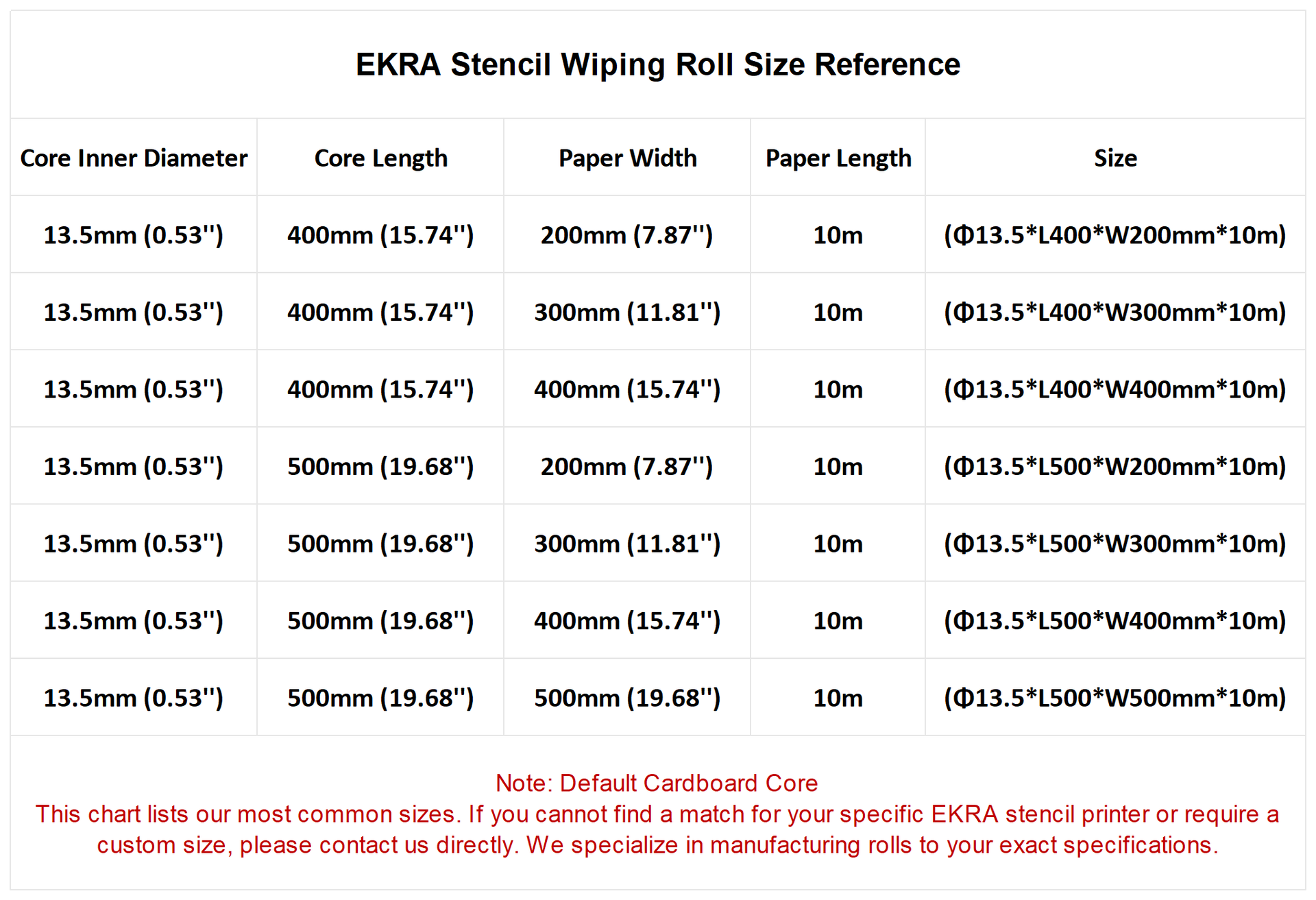 This chart details our standard wiping roll specifications, featuring a universal 13.5mm core inner diameter and 400mm/500mm core length. A variety of paper widths from 200mm to 500mm are offered, each supplied in a standard 10 meter length. For other requirements not listed, we provide expert custom manufacturing. Please contact us to discuss tailored solutions for your EKRA printer