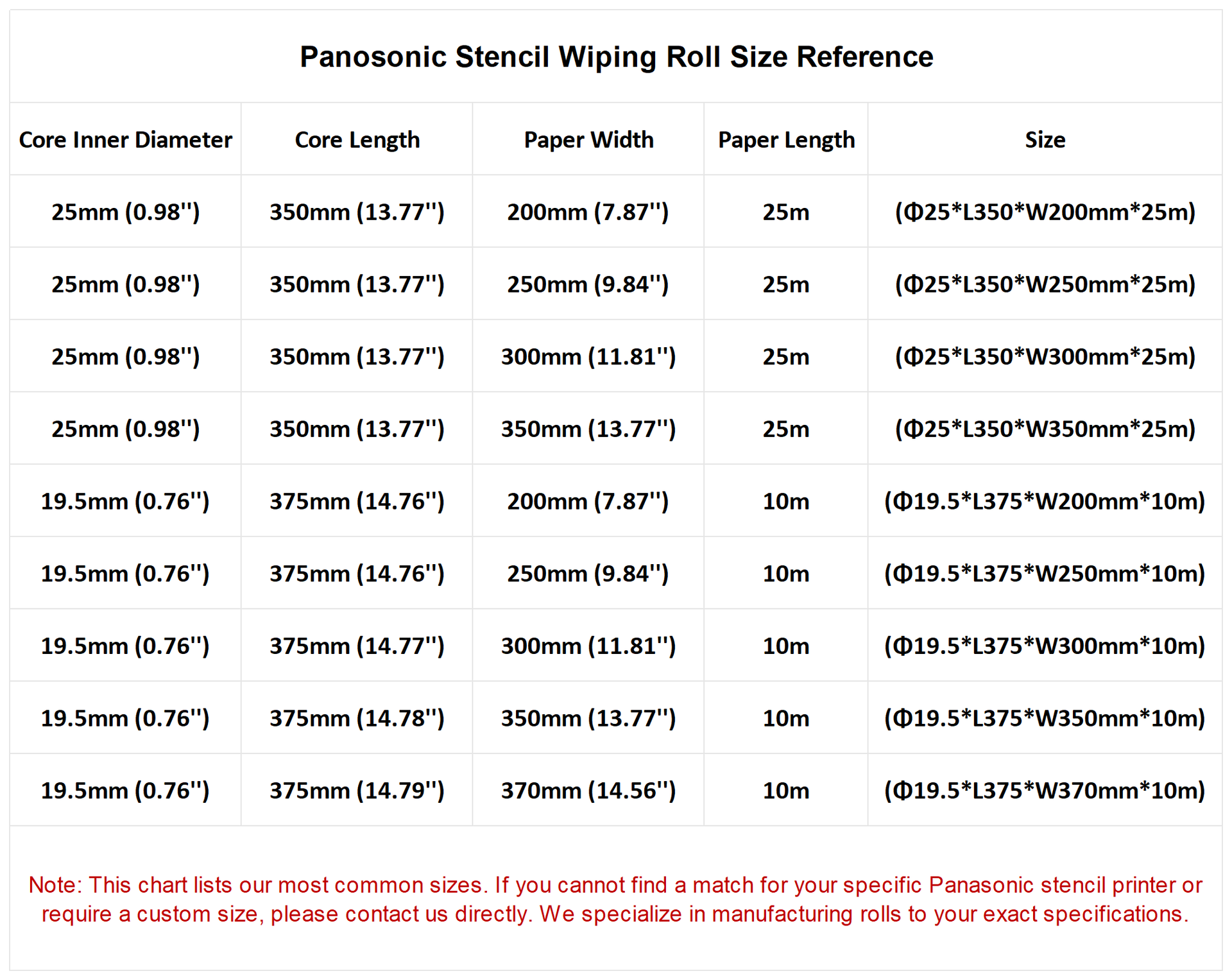 This chart details our standard wiping roll specifications, featuring a universal 25mm AND 19.5mm core inner diameter and 350mm and 375mm core length. A variety of paper widths from 200mm to 370mm are offered, each supplied in a standard 25 or 10 meter length. For other requirements not listed, we provide expert custom manufacturing. Please contact us to discuss tailored solutions for your PANASONIC printer